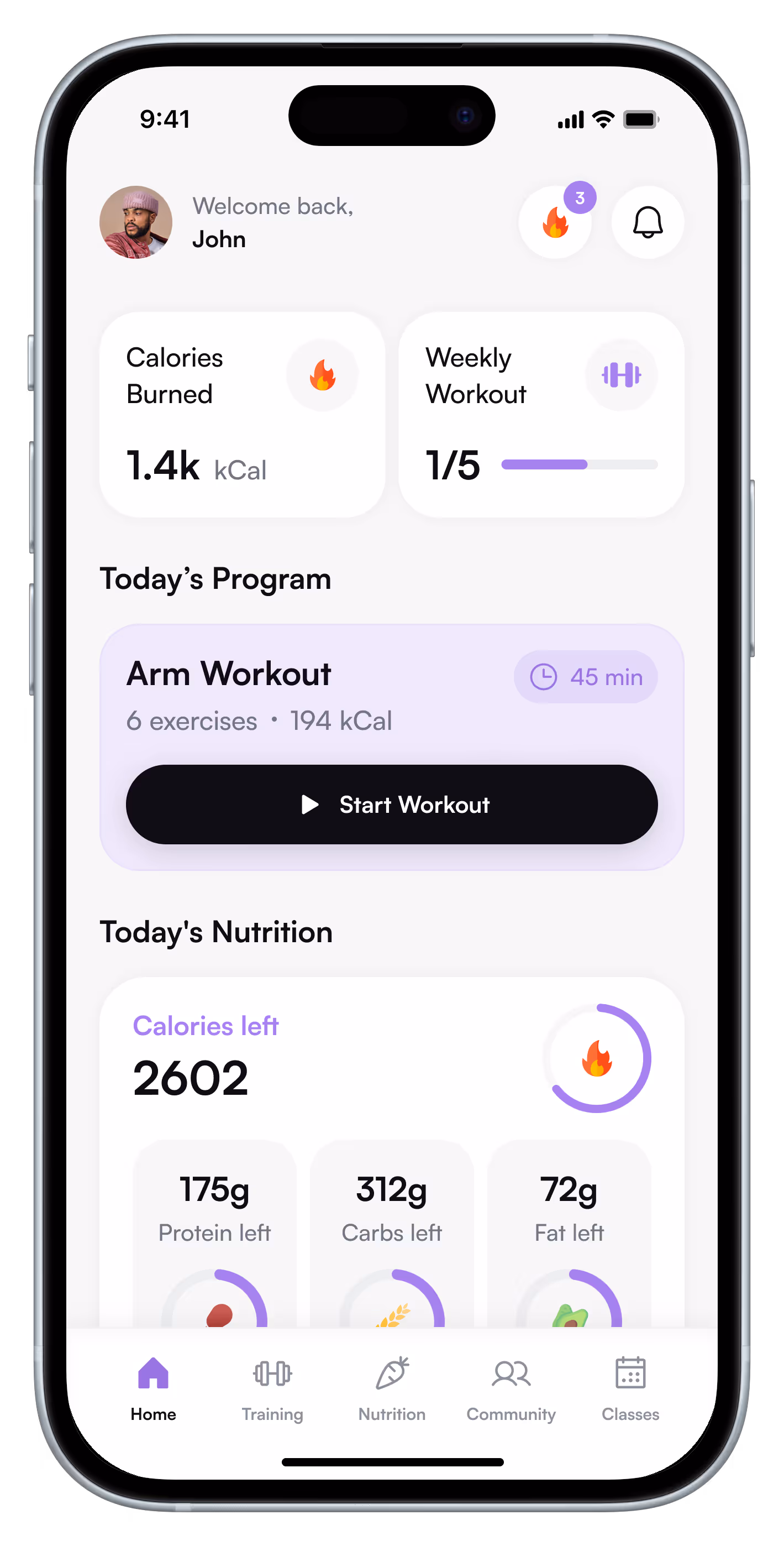 Workouts, nutrition, class booking, progress tracking, and community – all in one place.